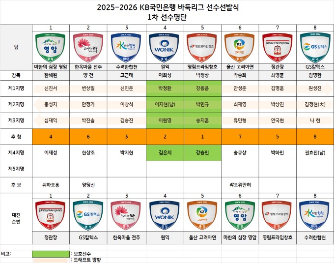 이어 한옥마을 전주가 변상일 9단(랭킹 7위), 수려한 합천이 신민준 9단(랭킹 3위), 울산 고려아연이 안성준 9단(랭킹 5위), 정관장이 김명훈 9단(랭킹 공동 8위), GS칼텍스가 원성진 9단(랭킹 공동 8위)을 각각 1지명으로 선발했다.
