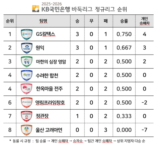 2025-2026 KB국민은행 바둑리그는 내년 2월까지 8개 팀이 더블리그 방식으로 총 14라운드 56경기를 치른다. 정규리그 상위 4개 팀이 포스트시즌에 진출해 우승 상금 2억 5,000만원을 놓고 최종 대결을 펼친다. 매 경기 5판 3선승제로 진행되며, 제한시간은 기본 1분에 추가 15초가 주어지는 피셔 룰이 적용된다.
