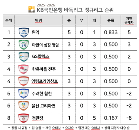 5라운드를 마친 결과, 원익이 5승 1패로 단독 선두에 나선 가운데, 중위권 팀들이 물고 물리는 혼전 속에 무려 6개 팀이 3승 3패 동률을 이뤘다. 치열한 순위 다툼이 예상되는 7라운드는 오는 11일 원익과 울산 고려아연의 경기로 재개된다.