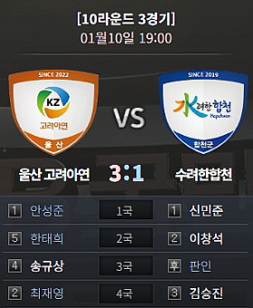 1ㆍ2지명의 연패로 벼랑 끝에 몰린 수려한 합천의 구원 투수로 외국인 선수 판인이 나섰다. 상대적으로 여유가 생긴 울산 고려아연은 4지명 송규상이 출전했다. 2017년 리민배에서 판인이 불계승을 거둔 이후 9년 만에 다시 만났다.