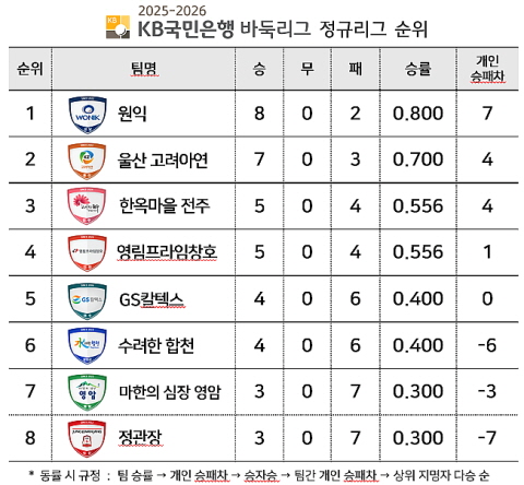 ○● 2025-2026 KB국민은행 바둑리그는 8개 팀이 더블리그 방식으로 총 14라운드 56경기를 치른다. 정규리그 상위 4개 팀이 포스트시즌에 진출해 우승 상금 2억 5,000만원을 놓고 최종 대결을 펼친다. 매 경기 5판 3선승제로 진행되며, 기본 시간 1분에 착수할 때마다 15초가 추가되는 피셔 룰 방식이 적용된다.