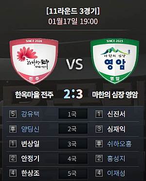 포스트시즌의 마지노선이라 할 수 있는 4위 자리를 근근이 지키고 있는 한옥마을 전주, 그리고 충격적인 5연패 수렁에서 벗어나야 하는 마한의 심장 영암이 만났다.