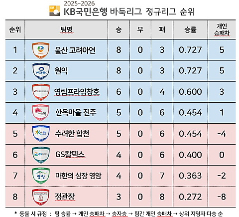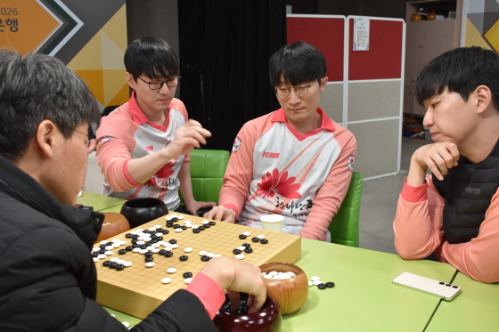 ○● 2025-2026 KB국민은행 바둑리그는 8개 팀이 더블리그 방식으로 총 14라운드 56경기를 치른다. 정규리그 상위 4개 팀이 포스트시즌에 진출해 우승 상금 2억 5,000만원을 놓고 최종 대결을 펼친다. 매 경기 5판 3선승제로 진행되며, 기본 시간 1분에 착수할 때마다 15초가 추가되는 피셔 룰 방식이 적용된다.