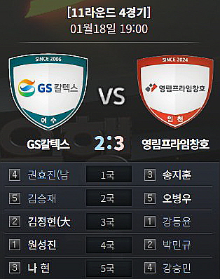 5국 영림프라임창호 강승민(4지명) vs GS칼텍스 나현(3지명)