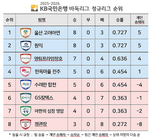 ○● 2025-2026 KB국민은행 바둑리그는 8개 팀이 더블리그 방식으로 총 14라운드 56경기를 치른다. 정규리그 상위 4개 팀이 포스트시즌에 진출해 우승 상금 2억 5,000만원을 놓고 최종 대결을 펼친다. 매 경기 5판 3선승제로 진행되며, 기본 시간 1분에 착수할 때마다 15초가 추가되는 피셔 룰 방식이 적용된다.