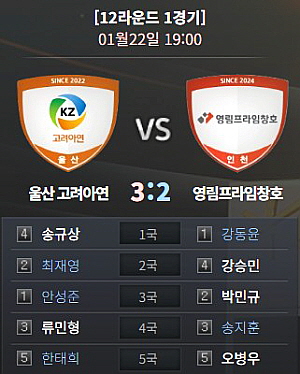 폭발적인 연승 질주를 이어가고 있는 단독 선두 울산 고려아연과 리그 후반으로 갈수록 강한 힘을 발휘하는 디펜딩 챔피언 영림프라임창호의 선두권 빅뱅이다. 영림이 전반기 2-3 석패를 설욕한다면 순위표에서 울산 고려아연과 자리를 맞바꿀 수 있다.