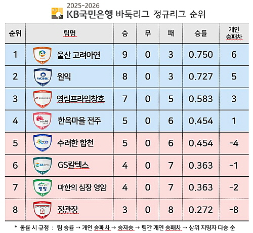 ○● 2025-2026 KB국민은행 바둑리그는 8개 팀이 더블리그 방식으로 총 14라운드 56경기를 치른다. 정규리그 상위 4개 팀이 포스트시즌에 진출해 우승 상금 2억 5,000만원을 놓고 최종 대결을 펼친다. 매 경기 5판 3선승제로 진행되며, 기본 시간 1분에 착수할 때마다 15초가 추가되는 피셔 룰 방식이 적용된다.