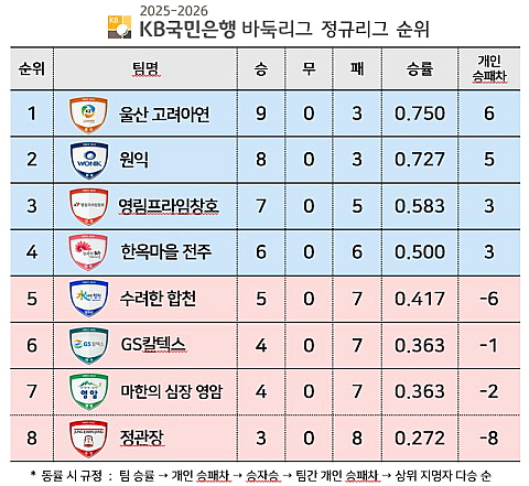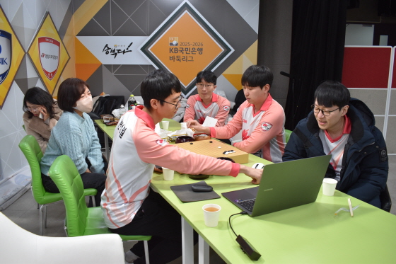 ○● 2025-2026 KB국민은행 바둑리그는 8개 팀이 더블리그 방식으로 총 14라운드 56경기를 치른다. 정규리그 상위 4개 팀이 포스트시즌에 진출해 우승 상금 2억 5,000만원을 놓고 최종 대결을 펼친다. 매 경기 5판 3선승제로 진행되며, 기본 시간 1분에 착수할 때마다 15초가 추가되는 피셔 룰 방식이 적용된다.