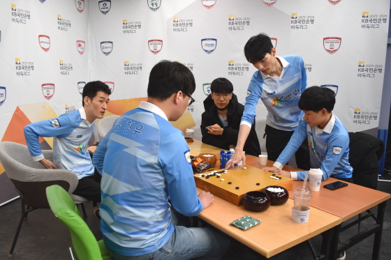 ▲ 이창석을 중심으로 주장 신민준의 2국을 검토하고 있는 수려한 합천 선수단