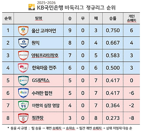 ○● 2025-2026 KB국민은행 바둑리그는 8개 팀이 더블리그 방식으로 총 14라운드 56경기를 치른다. 정규리그 상위 4개 팀이 포스트시즌에 진출해 우승 상금 2억 5,000만원을 놓고 최종 대결을 펼친다. 매 경기 5판 3선승제로 진행되며, 기본 시간 1분에 착수할 때마다 15초가 추가되는 피셔 룰 방식이 적용된다.
