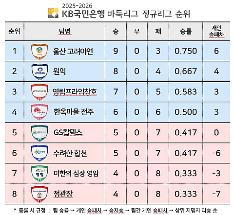 ○● 2025-2026 KB국민은행 바둑리그는 8개 팀이 더블리그 방식으로 총 14라운드 56경기를 치른다. 정규리그 상위 4개 팀이 포스트시즌에 진출해 우승 상금 2억 5,000만원을 놓고 최종 대결을 펼친다. 매 경기 5판 3선승제로 진행되며, 기본 시간 1분에 착수할 때마다 15초가 추가되는 피셔 룰 방식이 적용된다.
