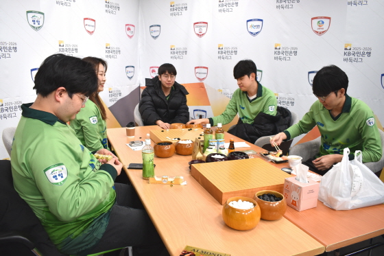 ▲ 2국 안국현의 대국 화면에 시선이 쏠린 정관장 선수단