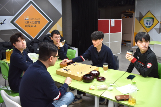 자정을 넘겨 0시 43분에야 끝난 처절한 승부. 25일(일) 한국기원 바둑TV 스튜디오에서 열린 2025-2026 KB국민은행 바둑리그 12라운드 4경기에서 정관장이 마한의 심장 영암을 장장 6시간에 가까운 혈투 끝에 3-2로 간신히 이겼다.