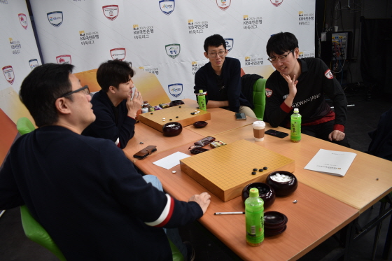▲ 막판까지 투샤오위 대국에서 눈을 떼지 못하는 GS칼텍스 김영환 감독과 선수들