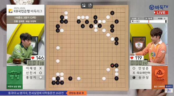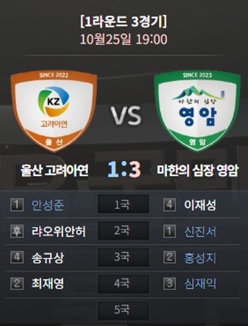 25일 한국기원 바둑TV 스튜디오에서 열린 2025-2026 KB국민은행 바둑리그 1라운드 3경기에서 마한의 심장 영암이 울산 고려아연을 3:1로 제압하고 산뜻하게 출발했다.