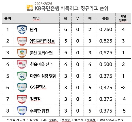 ○● 2025-2026 KB국민은행 바둑리그는 내년 2월까지 8개 팀이 더블리그 방식으로 총 14라운드 56경기를 치른다. 정규리그 상위 4개 팀이 포스트시즌에 진출해 우승 상금 2억 5,000만원을 놓고 최종 대결을 펼친다. 매 경기 5판 3선승제로 진행되며, 기본 시간 1분에 착수할 때마다 15초가 추가되는 피셔 룰 방식이 적용된다.