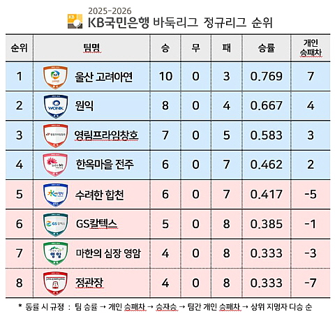 ○● 2025-2026 KB국민은행 바둑리그는 8개 팀이 더블리그 방식으로 총 14라운드 56경기를 치른다. 정규리그 상위 4개 팀이 포스트시즌에 진출해 우승 상금 2억 5,000만원을 놓고 최종 대결을 펼친다. 매 경기 5판 3선승제로 진행되며, 기본 시간 1분에 착수할 때마다 15초가 추가되는 피셔 룰 방식이 적용된다.