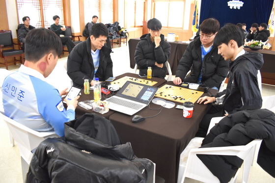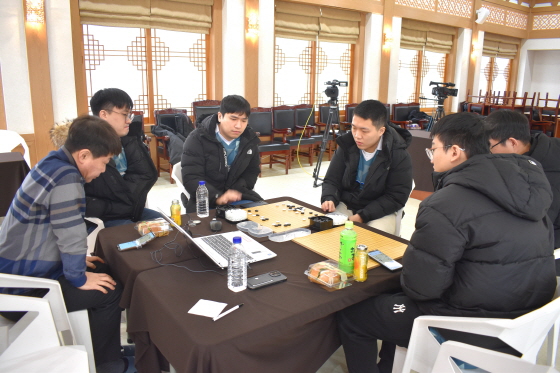▲ 박지현(가운데)이 1국을 승리한 후 분위기가 한층 밝아진 수려한 합천 검토실