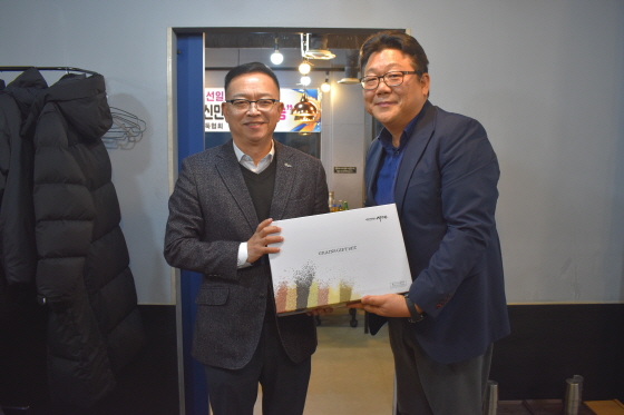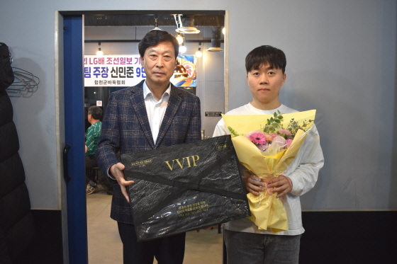 ▲ 유달형 합천군 체육회장(왼쪽)이 수려한 합천 팀 주장 신민준 9단의 LG배 우승을 축하하는 기념 선물을 준비했다.