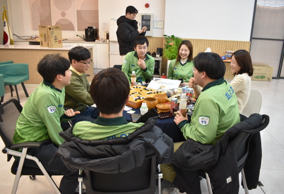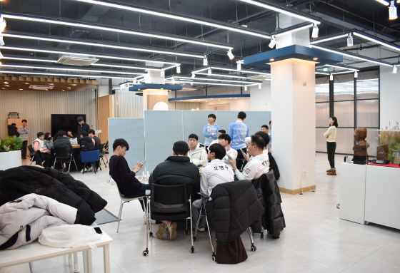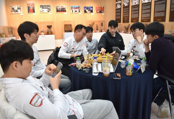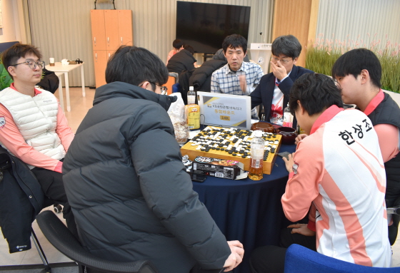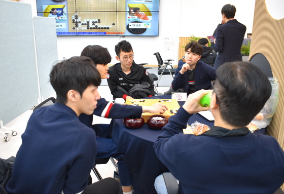 ▲ 정규리그 최종 라운드가 8개 팀 동시 대국으로 치러지면서 한국기원 신관 1층 라운지에 마련된 통합 검토실. 바둑TV 스튜디오에서 격돌한 원익과 울산 고려아연을 제외한 6개 팀이 한자리에 모이는 진풍경이 연출됐다.