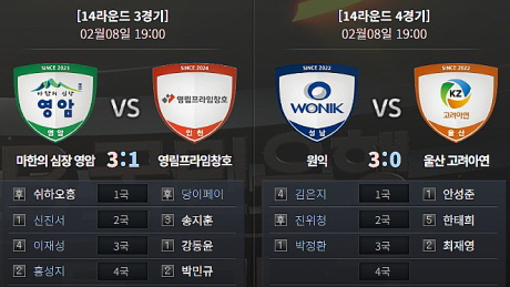 지난 13라운드에서 정규리그 1위를 확정한 울산 고려아연은 역대 최다 연승 타이 기록에 도전했지만, 원익에 패하며 10연승에 머물렀다. 원익은 9승 5패로 2위를 굳히며 플레이오프에 직행했다.