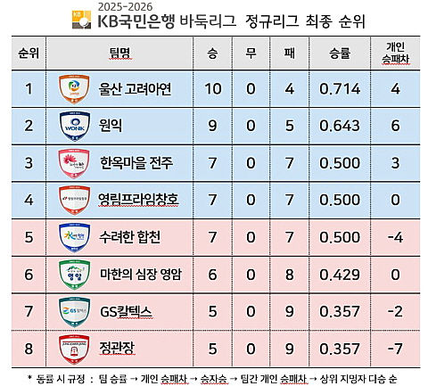 2025-2026 KB국민은행 바둑리그 정규리그 14라운드가 모두 종료되며 최종 순위가 확정됐다. 박승화 감독이 이끄는 울산 고려아연이 10승 4패로 정규리그 우승을 차지했다. 개막 3연패 이후 10연승을 내달리며 단숨에 1위로 올라섰으나, 최종 라운드에서 아쉽게 연승 행진이 멈췄다. 그럼에도 후반기를 휩쓴 상승세는 정규리그 1위를 거머쥐기에 충분했다. 주장 안성준을 필두로 최재영·류민형·송규상·한태희·랴오위안허가 돌아가며 승리를 이끈 팀워크가 빛났다.