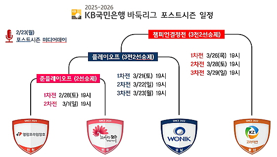 포스트시즌은 오는 28일 3위 영림프라임창호와 4위 한옥마을 전주의 준플레이오프로 막을 올린다. 준플레이오프 승자는 다음 달 21일부터 2위 원익과 챔피언 결정전 티켓을 놓고 플레이오프를 벌인다. 정규리그 1위 울산 고려아연과 플레이오프 승자가 격돌하는 대망의 챔피언 결정전은 같은 달 26일부터 치러질 예정이다.